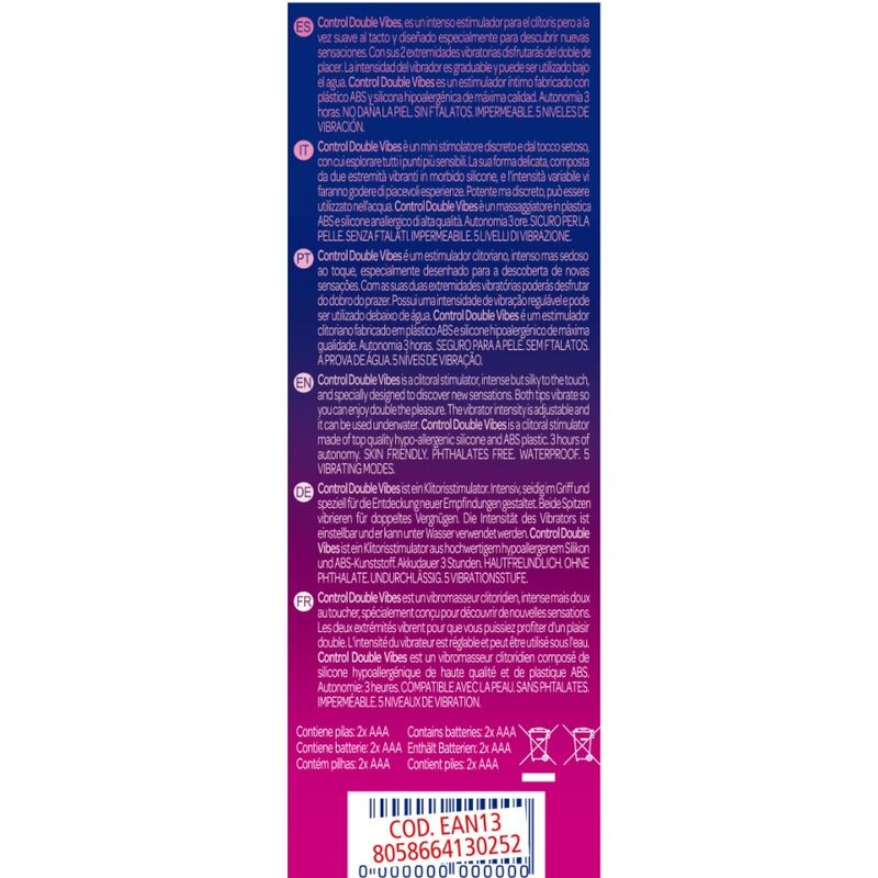 With its two vibrating limbs, you'll enjoy double the pleasure. The vibrator's intensity is adjustable and can be used underwater. Control Double Vibes is an intimate stimulator made of the highest quality ABS plastic and hypoallergenic silicone.
