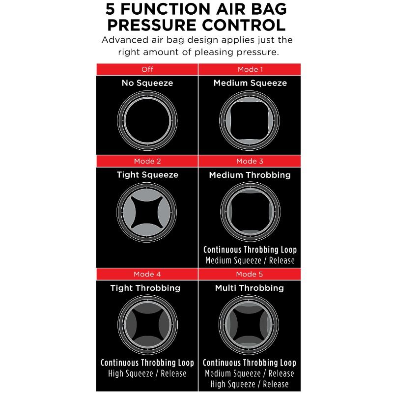 - 5-Function Airbag Pressure Control – The advanced airbag design applies just the right amount of comfortable pressure. Press to activate and hold for 3 seconds to release.