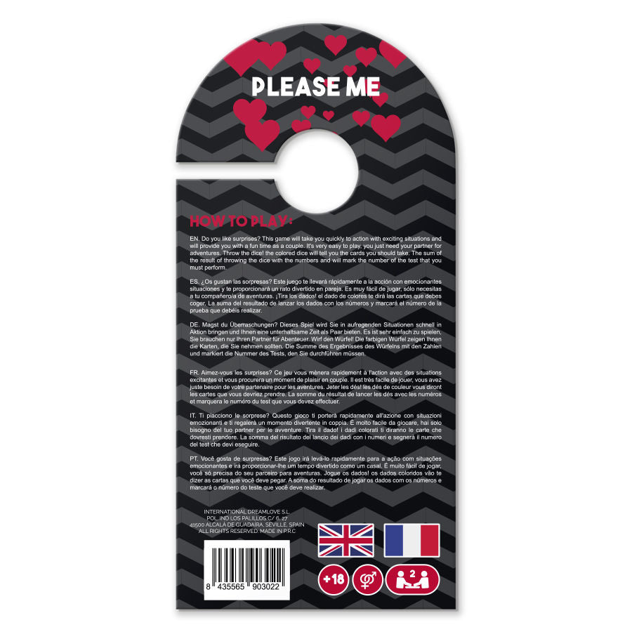¿Te gustan las sorpresas? Este juego te pondrá en acción rápidamente en situaciones emocionantes y te ofrecerá un momento divertido en pareja. Es muy fácil de jugar; solo necesitas a tu compañero de aventuras. ¡Tira los dados! Los dados de colores te muestran las cartas que debes tomar. El total de los dados con los números marca el número de la prueba que debes lanzar.
