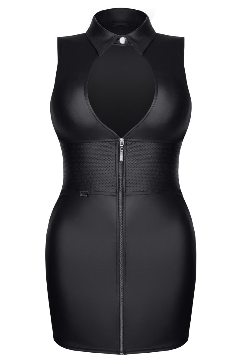 Wetlook Minikleid im Militärstil. Geöffnetes Dekolleté, wunderbar betonte Taille. Dekorativer Reißverschluss vorne.