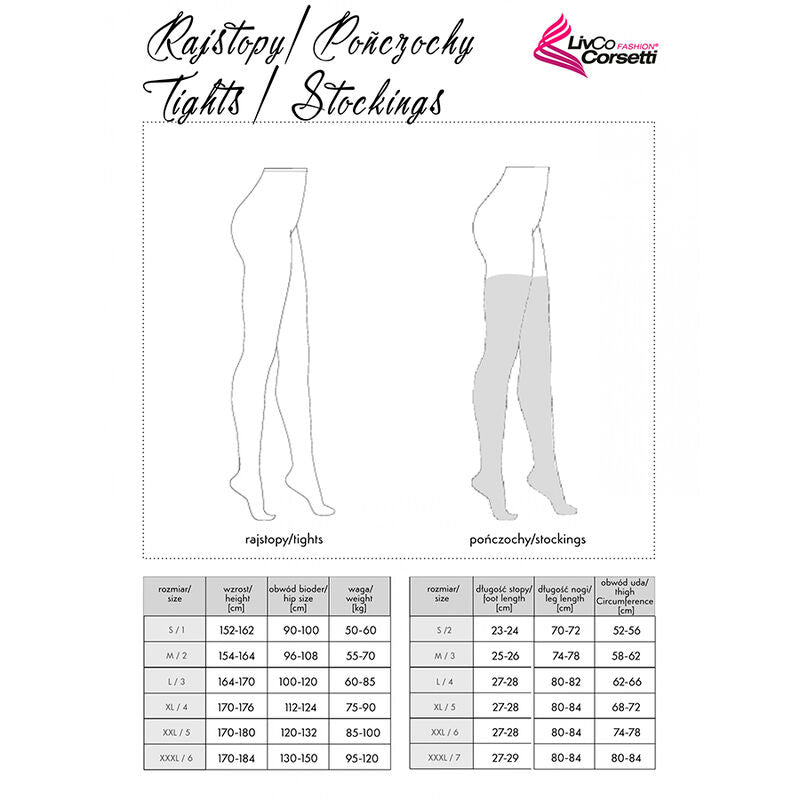 Las exclusivas medias de LivCo Corsetti fueron creadas para mujeres liberadas y seguras de sí mismas que no temen a su atractivo sexual. Las medias son un básico de armario que ha conquistado el corazón de muchas mujeres y otras. Resaltan la belleza de las piernas a la vez que son sensuales y emocionantes. Este modelo combina un cinturón de encaje con las medias, complementando a la perfección otros elementos de lencería erótica. Es ropa interior ideal tanto para ocasiones especiales como para el día a día. El encaje en el muslo sin duda atraerá la atención hacia tus piernas. Estas exclusivas medias revelan una sensual sorpresa a su propio ritmo. Un modelo de lencería para auténticas seductoras que buscan destacar. Las medias están confeccionadas con material resistente y de alta calidad, lo que garantiza una larga duración. Disponibles en tallas S-L.