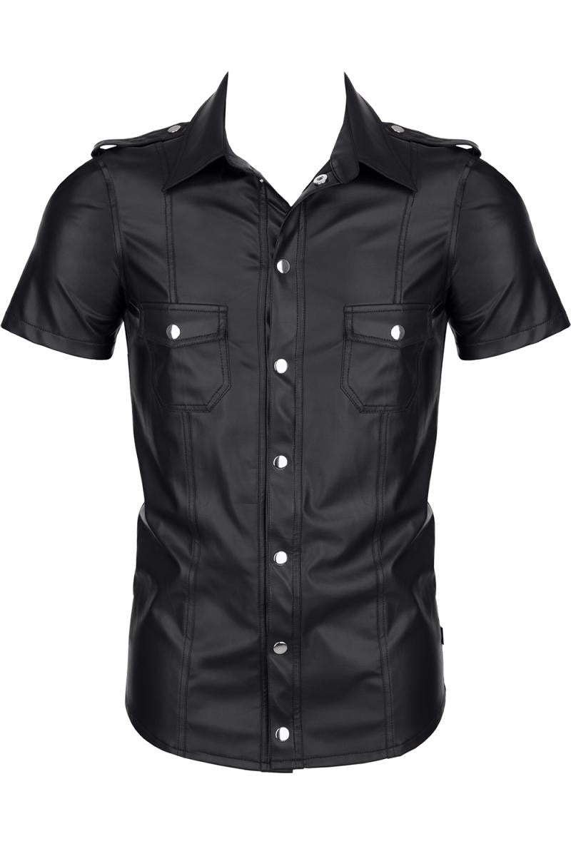 Herren Hemd, gefertig aus mattem, dehbarem Wetolook Material, mit Stehkragen und Druckknöpfen aus Metall. DIe Taschen dien ohne Druckknopf. SLim-Fit.