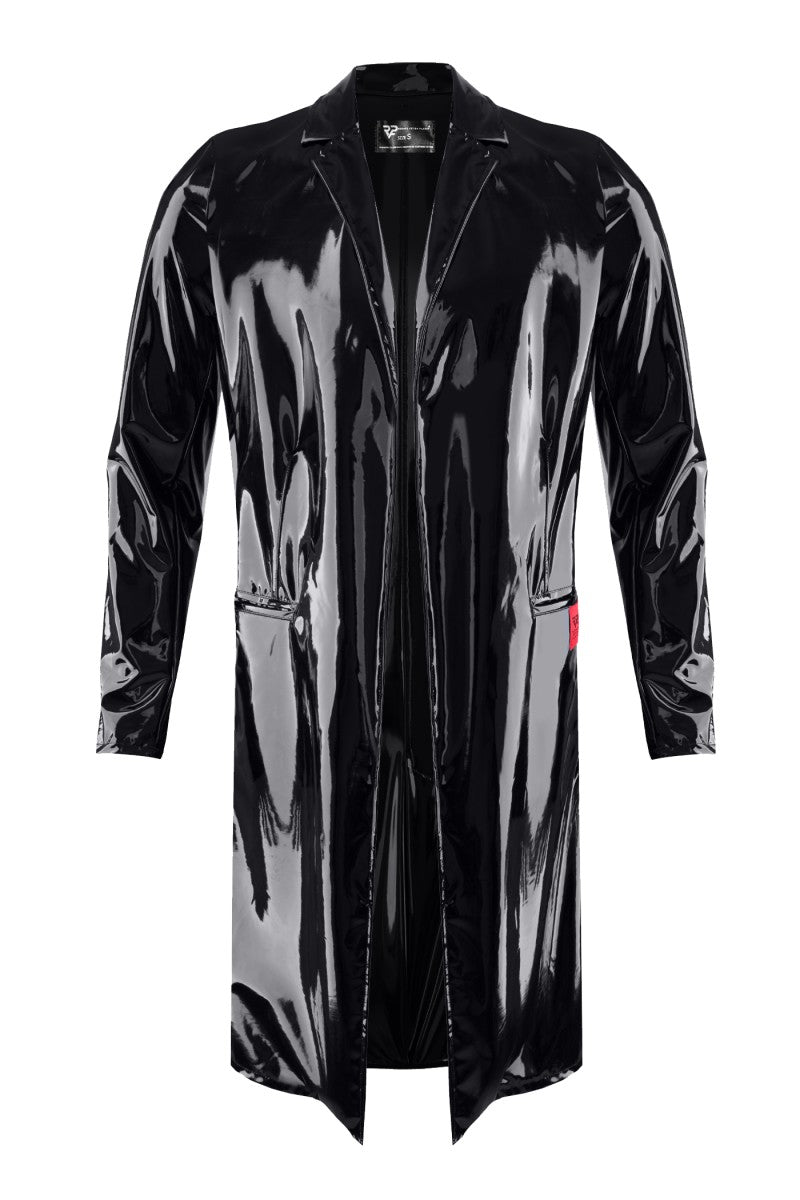 Eleganter, klassischer, langer Mantel aus schwarzem, glänzendem Lack Material. Profilierte Slim-Fit-Form.