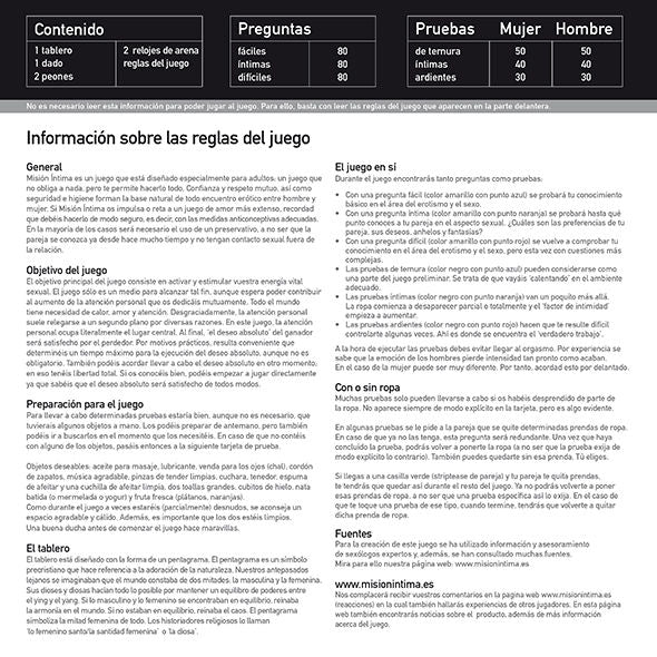 Misión Íntima te lleva a un viaje de descubrimiento donde la diversión es primordial. A través de 480 preguntas y actividades, tú y tu pareja descubrirán lo que más disfrutan. El juego comienza con pruebas tiernas y románticas, luego pasa a actividades más íntimas y, finalmente, a las más apasionadas, donde todo vale y nada es obligatorio. Derribamos barreras de forma lúdica y nos acercamos más. El juego es cautivador, emocionante, directo y atrevido, a veces divertidísimo, pero siempre con respeto y buen gusto. No hay obligaciones en este juego y todo se puede personalizar a tu gusto.