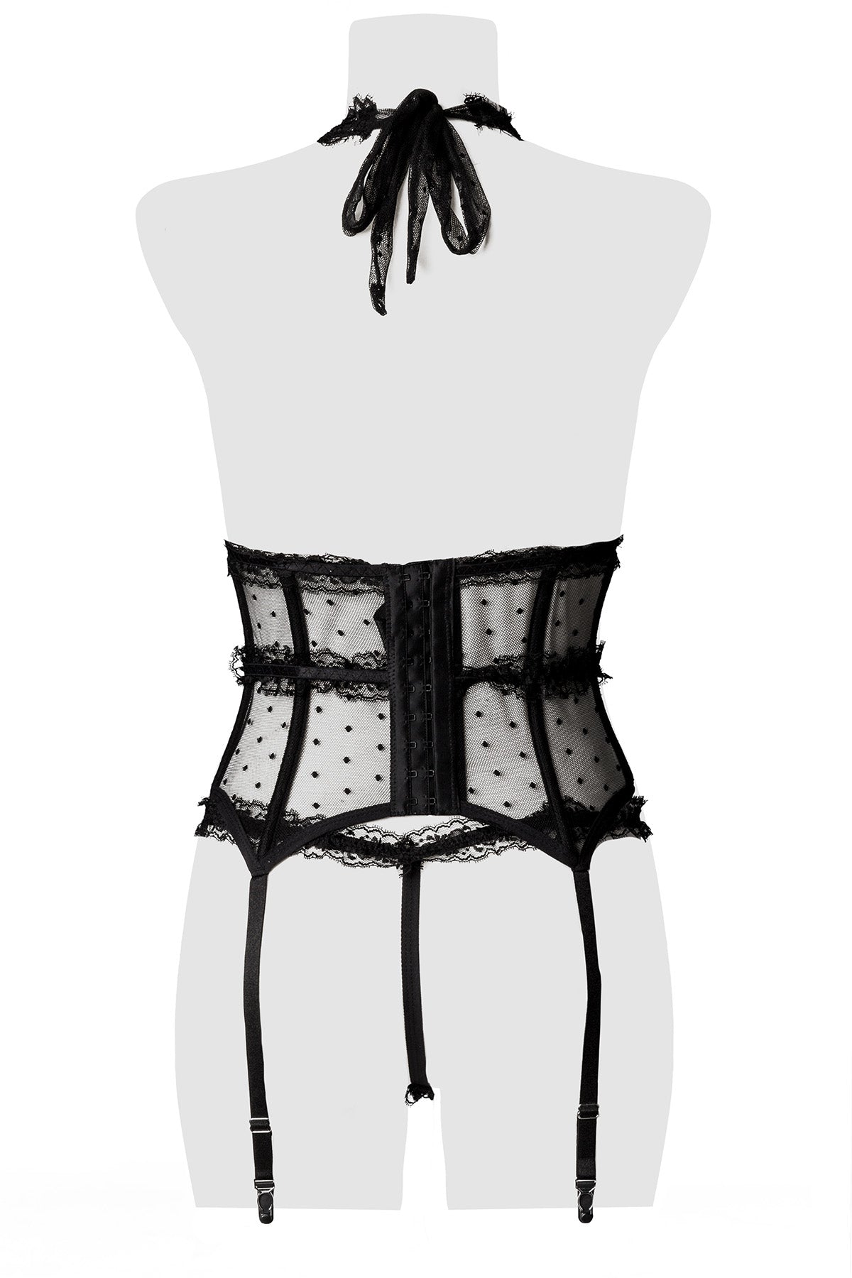Set gefertigt aus feinem Netzmaterial mit Muster und Spitze. Bestehend aus Nechkolder Gorset und String. Dreifach verstellbare Hakenverschlussleiste auf der Rückseite. Die Strumpfhalter sind verstellbar.