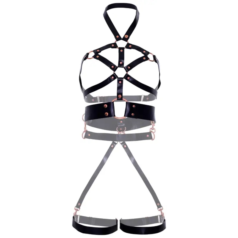 Dieses provokante Körpergeschirr vereint gewagte Eleganz mit sinnlicher Kontrolle. Die O-Ring-Nieten und befestigten Strumpfhalter verleihen einen verführerischen Look. Der abnehmbare Rückenriemen bietet zusätzliche Vielseitigkeit. Vervollständige deinen Look mit passendem Brustwarzenschmuck!
